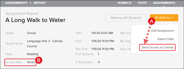 1. Click on the Actions button and select Send Scores to Canvas from the menu.