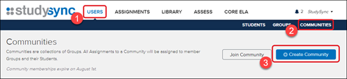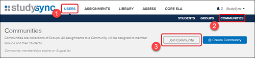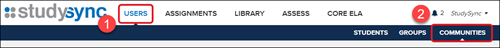1. After launching StudySync, click on Users from the top menu.2. Click Communities from the submenu.
