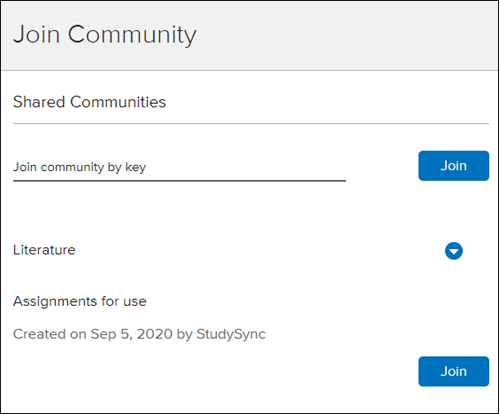4. Enter the Community Key provided to you by the teacher that created the Community OR click on the Community name to expand the public community option. Click the Join button.