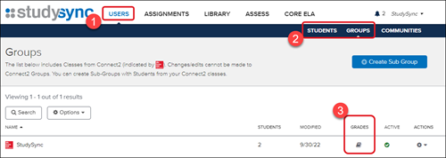 1. After launching StudySync, click on Users in the top menu bar.2. Select Groups or Students from the second menu bar.