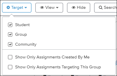 Target - Allows to filter down to a specific target such as students, groups, or .community.
