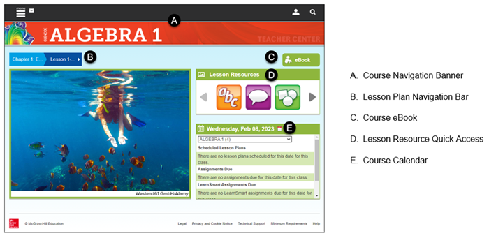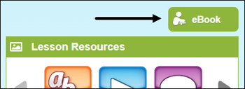 To open the Course eBook, click the eBook button that is located above the Lesson Resources on the right side of the screen.The eBook will open to the selected chapter and lesson from the Lesson Plan banner.