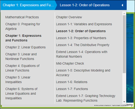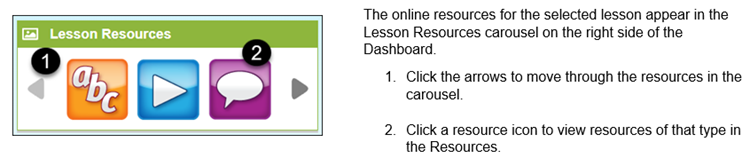 The current chapter and lesson for the selected class display on the Dashboard. The chapter and lesson correspond with your current class schedule.To view a different lesson's information on the Dashboard, click the Navigation Bar. Select the desired Chapter and Lesson from the drop-down list.