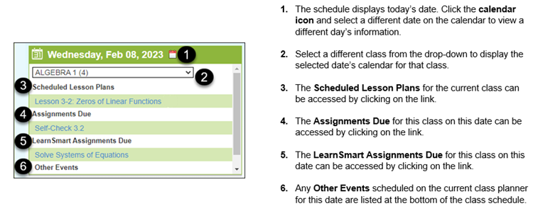 The Class Schedule on the right side of the Dashboard displays your scheduled lesson plans, assignments due, and other scheduled events based on what is in your calendar.