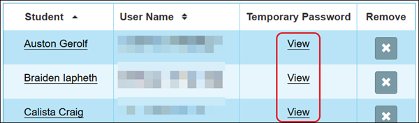 4. Click the View link in the Temporary Password column to the right of the student.