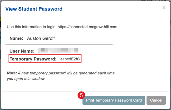 5. On the View Student Password pop-up, click the Print Temporary Password Card button or provide the Temporary Password provided on the pop-up to the student.