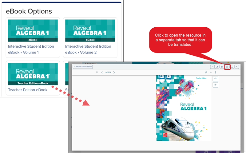 Note: We cannot guarantee that all resources and programs will translate using the Google Translate feature. For some resources, such as those that open in a pop-up on the same browser tab, will need to be opened in a secondary browser tab or window to properly translate. For example: Open Learning Platform eBook resources.