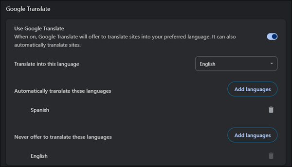 Navigate to chrome://settings/languages to set your Preferred languages and Google Translate options.
