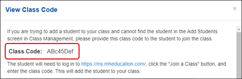If you would like students to roster themselves to a class using their existing student account, they will need the 8-character Class Code to do so. For steps on how they would redeem the Class Code to their existing student account, refer to the How To Join a McGraw Hill Class and Redeem Content article.