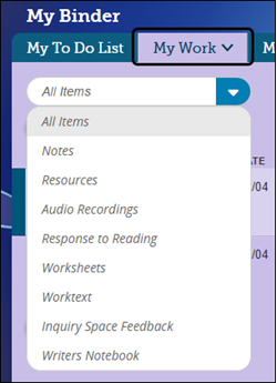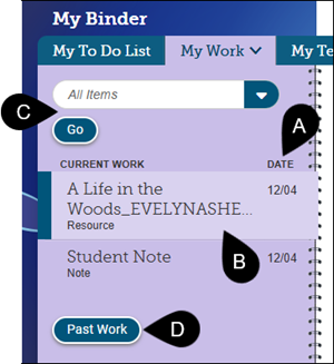 To access notes, certain resources, audio recordings, etc., click on the My Work tab.