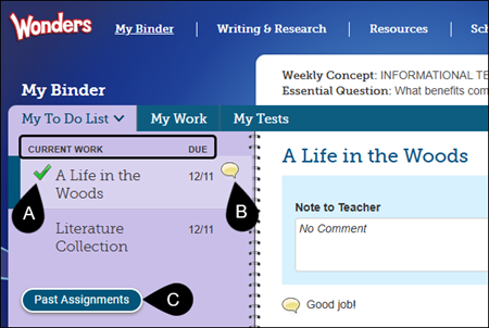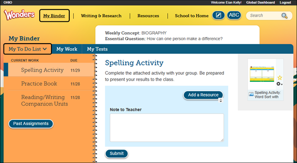 Learn how students use Wonders 2020 My Binder to view assignments, submit work, manage resources, and access tests.
