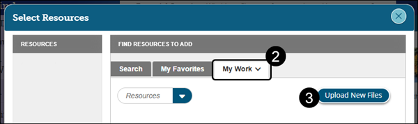 2. Click on the Search, My Favorites, or My Work tab to attach the desired resource.