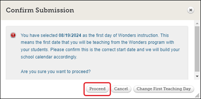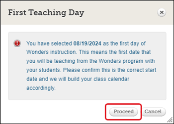 9. On the First Teaching Day pop-up, click the Proceed button. Click Cancel to select a different day.