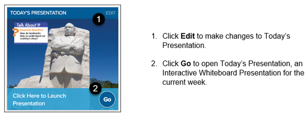The Presentation provides you with all of your lesson materials in a projectable, digital format for your current day of instruction, based on today's calendar.