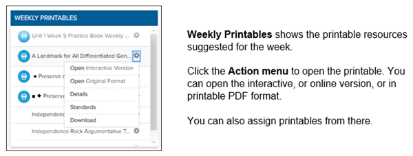 4. Select the Action menu to Open this Resource, view the resource Details or Standards, and Assign this Resource through Wonders or Google Classroom.