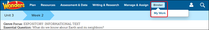 A. Your Binder resources for the current Unit and Week is displayed on the My Work tab.