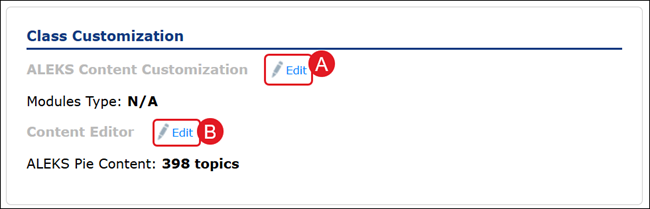 A. Click the Edit link for ALEKS Content Customization to creating modules or self-paced options for students.