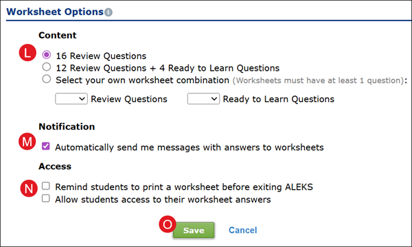 N. Select the box next to Remind students to print a worksheet and/or Allow students access to their worksheet answers.