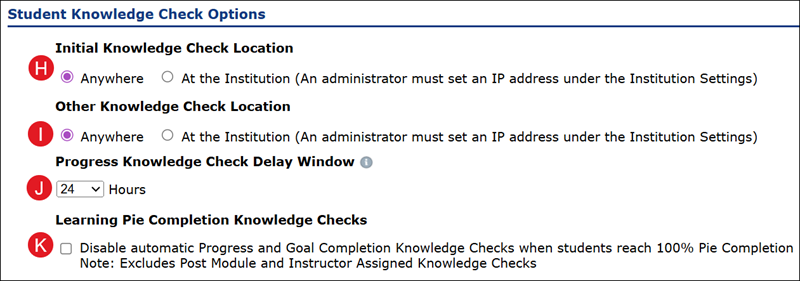 K. Check the Learning Pie Completion Knowledge Checks box if you would like to disable automatic Progress and Goal Completion Knowledge Checks when students have reached 100% Pie completion.