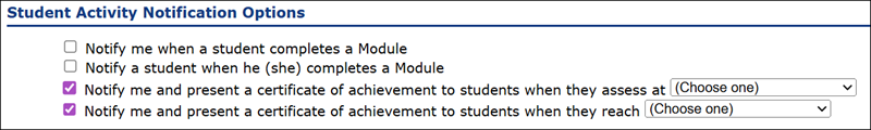 If the selections for notifications and sending a certificate are selected, teachers will also need to select a syllabus and/or progress option from the drop-downs.