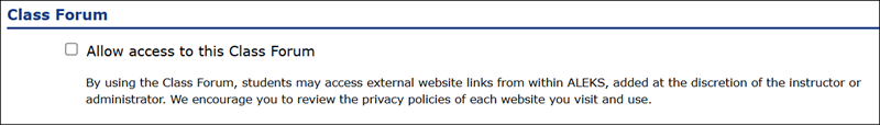 Note: By using the Class Forum, students may access external website links from within ALEKS, added at the discretion of the instructor or administrator. We encourage you to review the privacy policies of each website you visit and use.