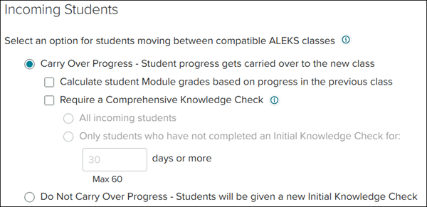 If you select Do Not Carry Over Progress, the students will be prompted to complete a new Initial Knowledge Check.