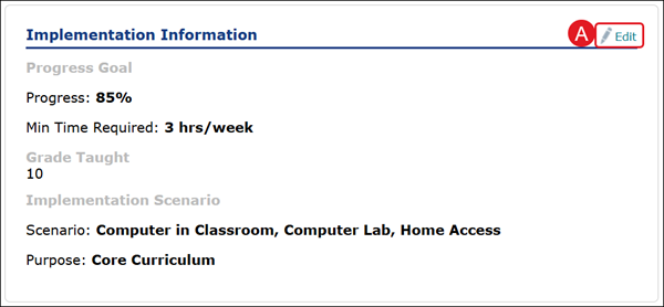 In the Implementation Information section, teachers can set Pie progress goals for students, set the minimum time required to be within the program, select the grade level for the course, as well as set the location in which students can access the program.