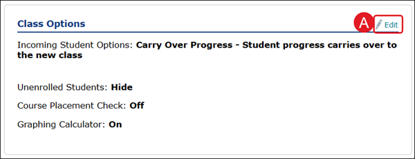 In the Class Options section, teachers can adjust the settings for Incoming and Unenrolled Students and turn on/off the Course Placement Check and Graphing Calculator.