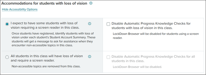 E. Click the Show Accessibility Options link to expand the section. Select the radio button and check the box beside the preferred selections.