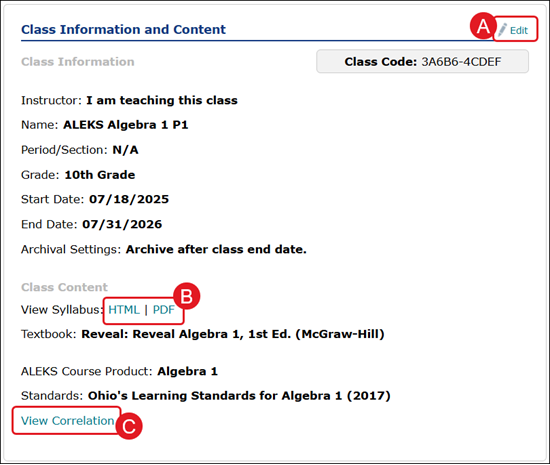 In the Class Content section, teachers can download a copy of the Syllabus, view Standards correlations, and integration a Textbook to the course.