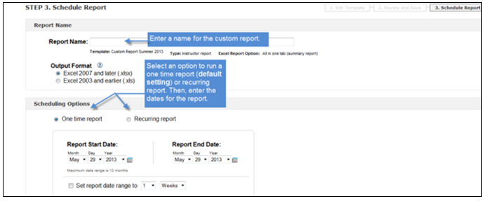 Step 3: Schedule when and how often to run the report. Reports can be scheduled to run one time, or they can be scheduled to recur daily, weekly, or monthly.