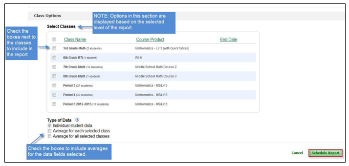 Specify which classes at the school should be included in the report and if you’d like averages by class included as well:
