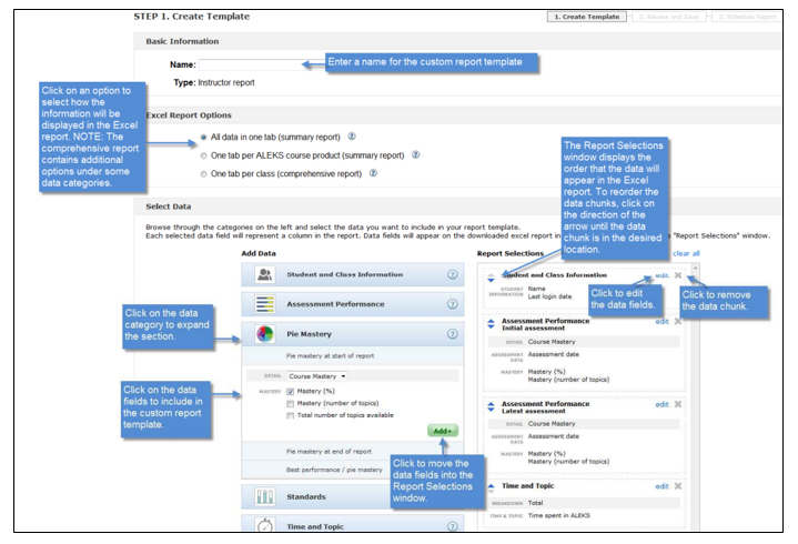 Step 1: Create the template by selecting data from existing ALEKS reports. Several actions can be performed on this page: