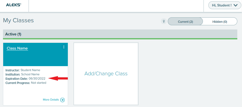 When you purchase an access code online through your ALEKS account, it automatically applies the access code to your account during the online purchase process once you click on “Complete Registration.” To confirm the access code was applied successfully to your account, login into your ALEKS account and check the expiration date on your class tile, see example below.