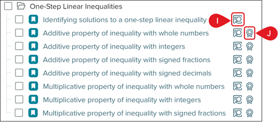 Expanding down to the individual topics allows you to preview (I) and view the associated standards (J).