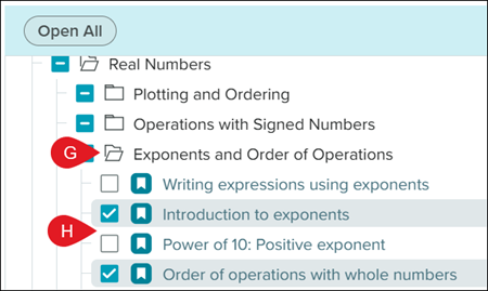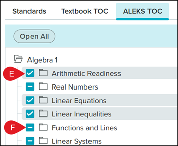 Options with a checkmark (E) have all topics for that section currently assigned for student completion, while everything with a dash (F) only has a selection of topics assigned for that section.