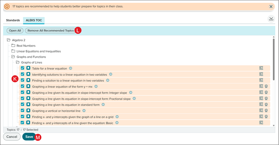 Depending on the topics selected, the ALEKS program may suggest Prerequisite Recommendations for topics to add to the syllabus to better help students prepare for the topics in the class.