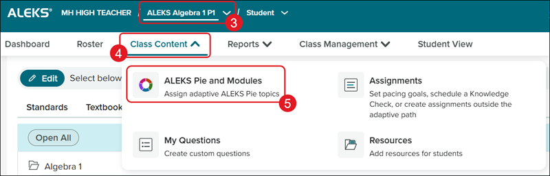 Self-paced content is the default setting in ALEKS. It allows students to work in their adaptive path on any topic from the Pie they are ready to learn. The content in the Pie comes pre-selected by ALEKS based on course and state standards. This article shows teachers how to edit the Pie content by adding or removing topics.